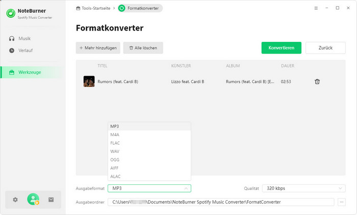 Neben der Konvertierung von Spotify-Musik unterstützt NoteBurner Spotify Music Converter auch die Konvertierung normaler Musikdateien in das MP3/M4A/FLAC/WAV/OGG/AIFF-Format. Öffnen Sie einfach NoteBurner, klicken Sie auf „Werkzeuge“ >> „Formatkonverter“ und fügen Sie dann Musik von Ihrem Computer zum Konvertieren hinzu.
