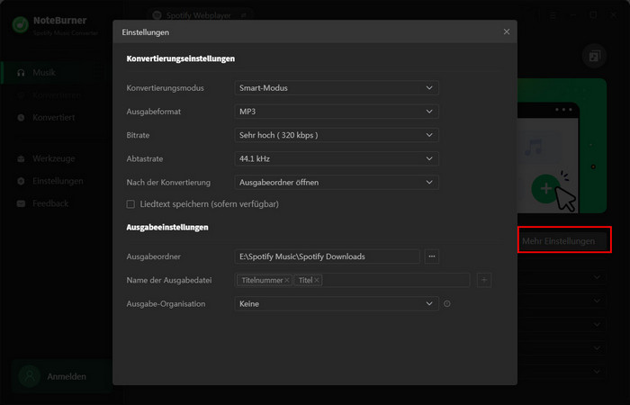 Sie können Konvertierungseinstellungen direkt auf der Hauptoberfläche auswählen, einschließlich Konvertierungsmodus, Ausgabeformat (Auto, MP3, AAC, FLAC, AIFF, WAV oder ALAC), Bitrate (128 kbps, 192 kbps, 256 kbps, 320 kbps) und Abtastrate (44,1 kHz, 48 kHz). Darüber hinaus können Sie den Ausgabepfad anpassen und den Namen der Ausgabedatei organisieren, indem Sie rechts auf die Schaltfläche „Mehr Einstellungen“ klicken.